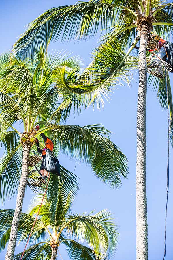 We use sterilized hand saws instead of machetes.  This palm trimming method thoroughly cleans out the crown, removing all excess plant matter, and rats nests (it’s an instant eviction notice!).  All damaged, old fronds (leaves) are carefully removed.