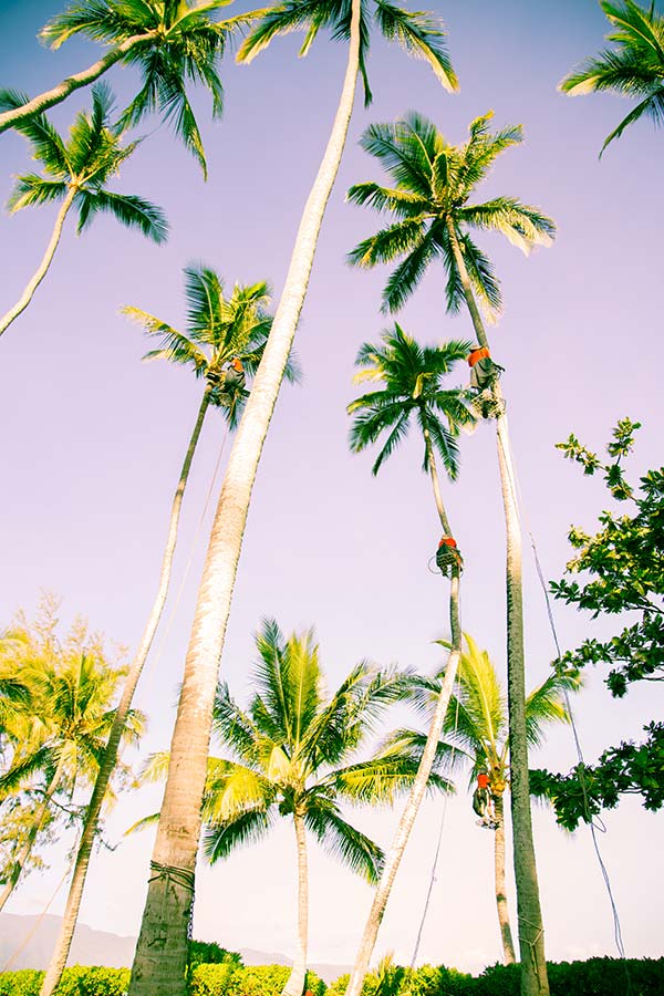 Our clients generally prefer a ‘full trim’ which entails removal of all young coconut growth.  However, people are catching on to the magic health benefits and scrumptious flavor of the coconut, and every year we find ourselves doing more ‘harvest trims’ in which we leave all the young coconuts in the crown to come back for future harvests.  This way, the palm is constantly producing coconuts to harvest and enjoy!